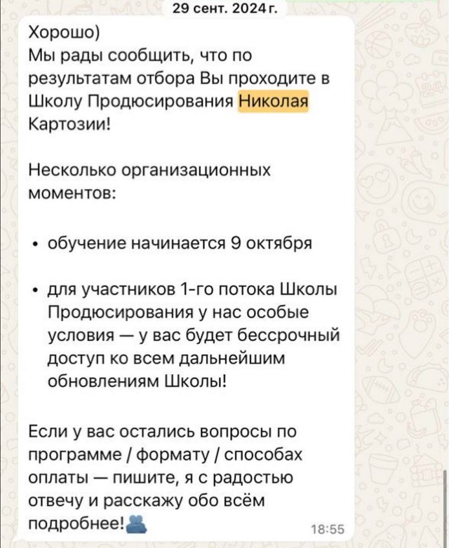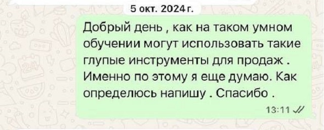 Оказывается, Анна не только прошла отбор, но и была зачислена на курс. Однако, когда дело дошло до оплаты, начались настойчивые требования и запугивания о том, что “места быстро заканчиваются”.