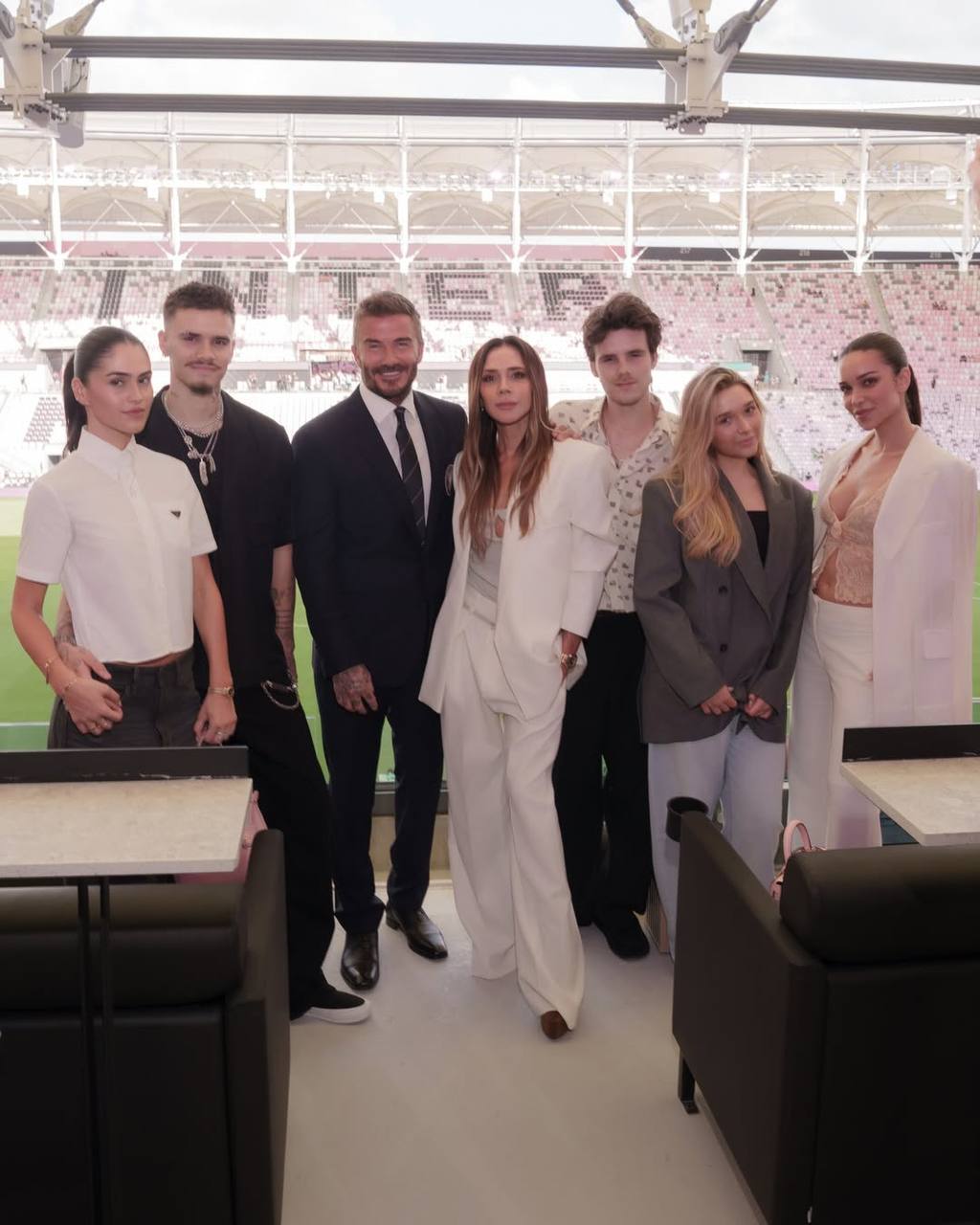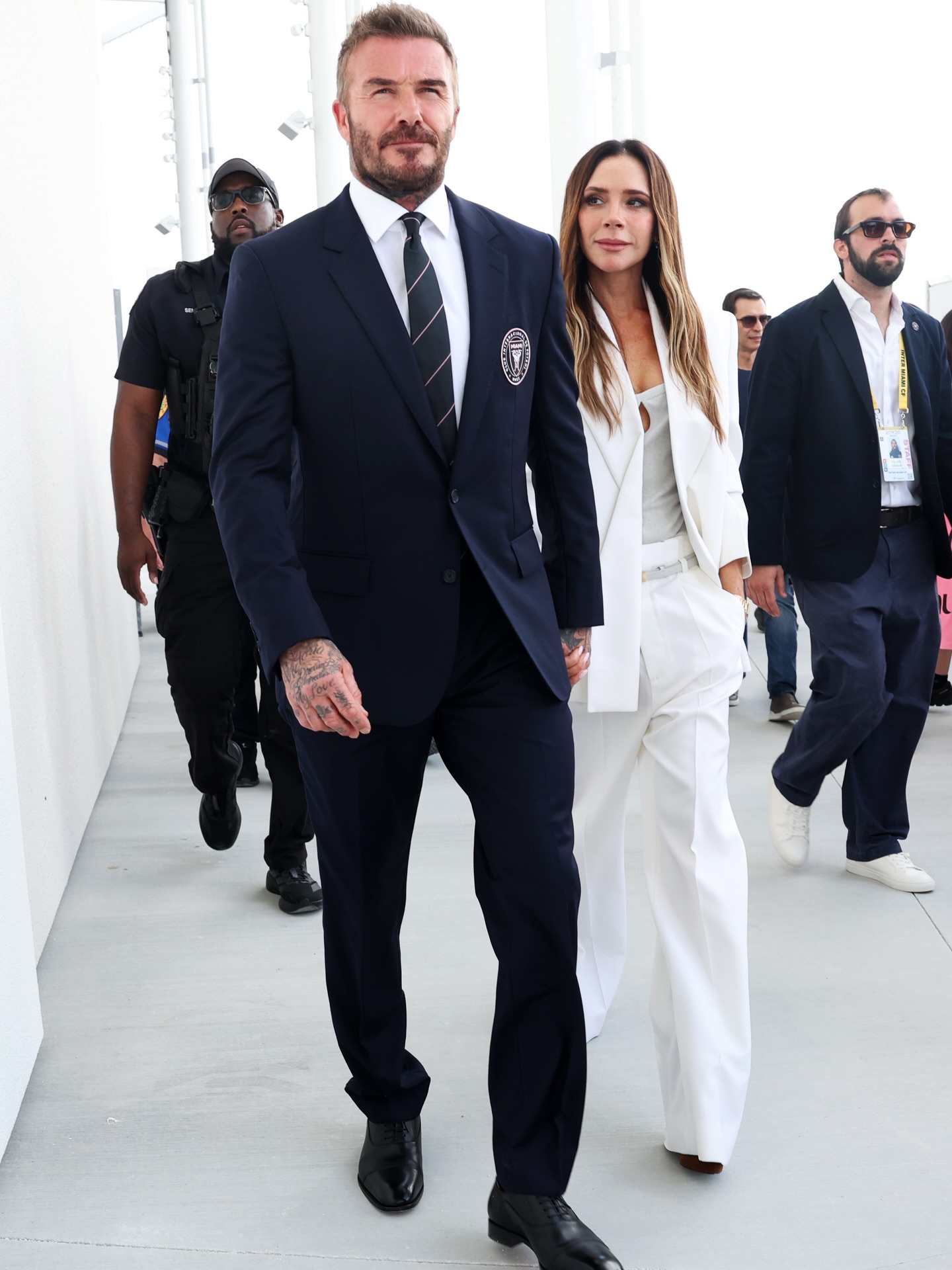 Торжественное открытие арены стало поводом для масштабного семейного выхода Бекхэмов. 50-летний экс-капитан сборной Англии появился на публике в безупречном темно-синем костюме с полосатым галстуком. Его супруга Виктория появилась в элегантном белоснежном ансамбле.