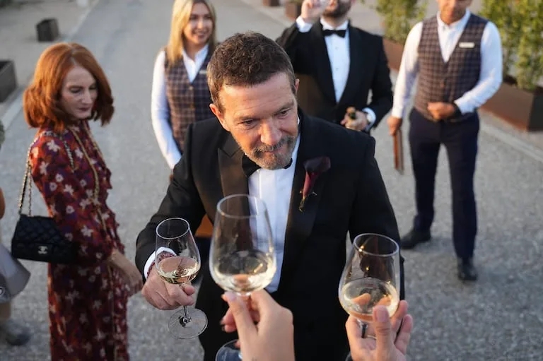На фото с торжества видно, как гордый отец невесты приветствует гостей с бокалом шампанского. Папарацци отмечают, что актер был в приподнятом настроении, шутил и тепло общался с журналистами.