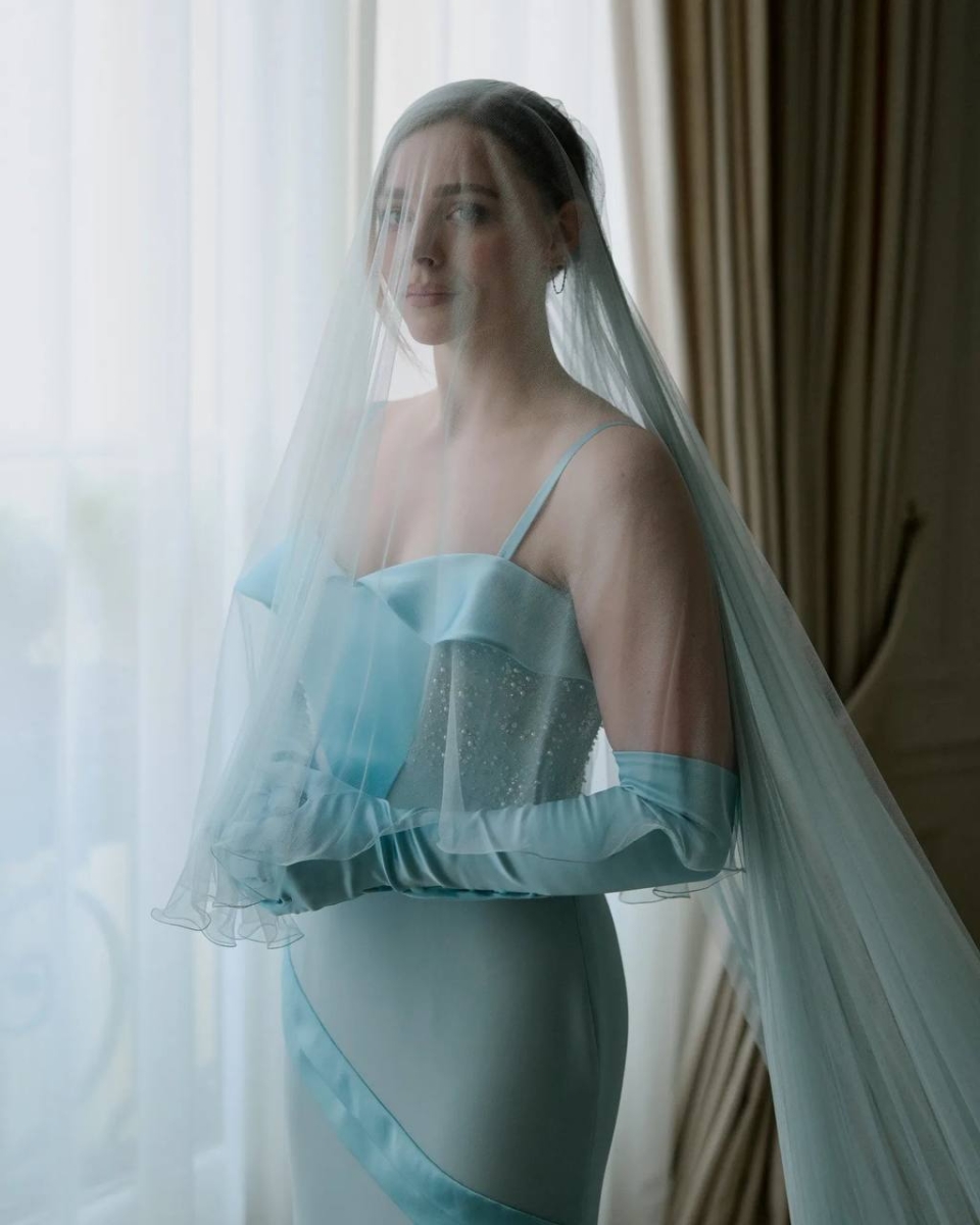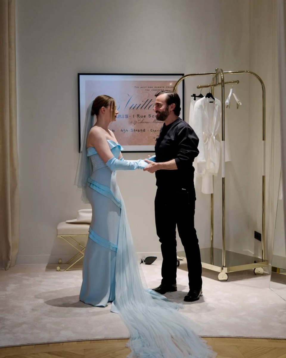 Обе невесты выбрали образы от Louis Vuitton. Морец предстала в светло-голубом платье на церемонии, а на афтепати переоделась в белый жакет с брюками и ковбойской шляпой. Харрисон предпочла кружевной бюстье с юбкой, а позже сменила его на корсет с брюками.