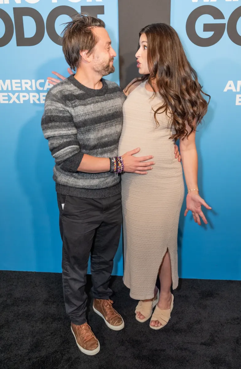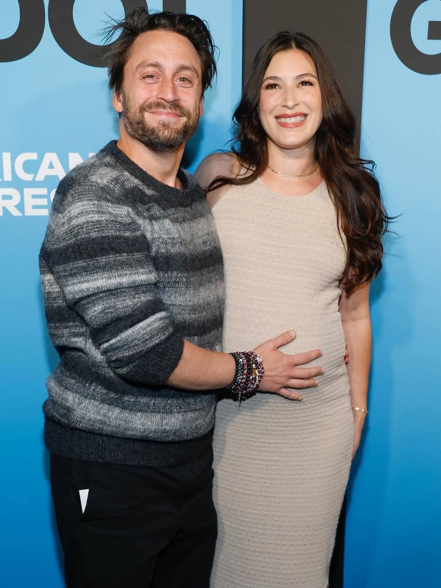 Джэзз выбрала бежевое платье, которое подчёркивало её округлившийся живот, а Киран — непринуждённый образ в сером полосатом свитере и чёрных брюках. Артист, сияя от счастья, нежно положил руку на живот супруги.