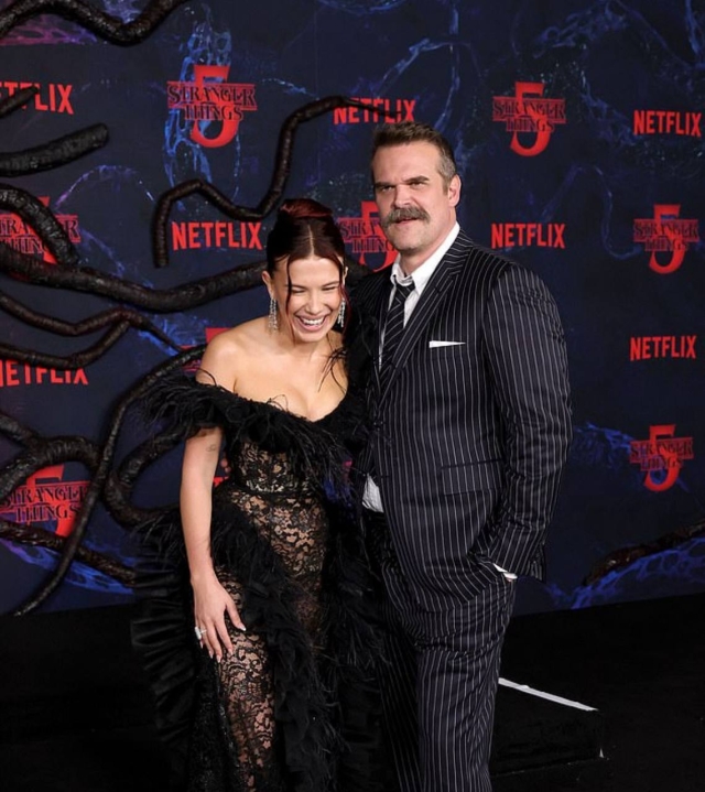 Впрочем, помимо главных героев, на красной дорожке блистали и другие звезды сериала: Вайнона Райдер, Джо Кири, Наталия Дайер, Чарли Хитон, Майя Хоук и Джейми Кэмпбелл Бауэр. И хотя их появление было привычным, история Милли и Дэвида добавила премьере нотку интриги и недоумения.