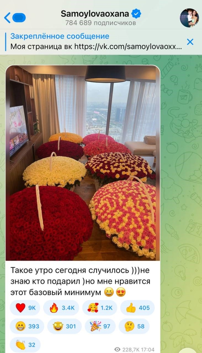 По словам Самойловой, в её квартиру привезли сотни, а возможно, и тысячи роз. Цветочный сюрприз оказался настолько грандиозным, что работники едва справились с разгрузкой.