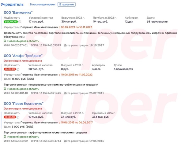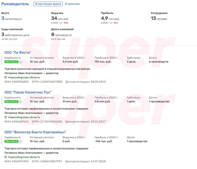 Анализ финансовых показателей компаний, связанных с Иваном Петренко, за 2024 год, по данным Super, выглядит следующим образом:
