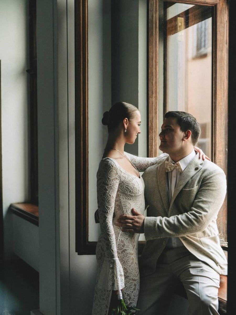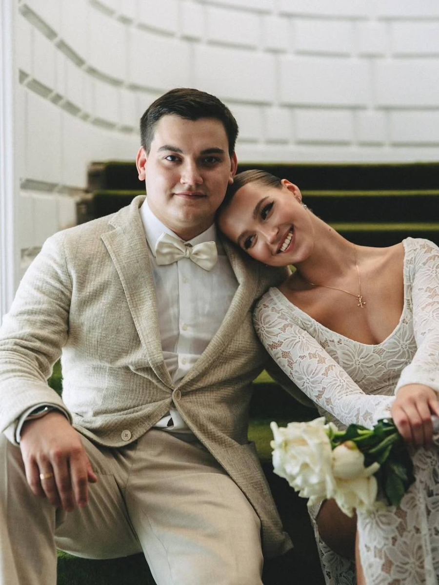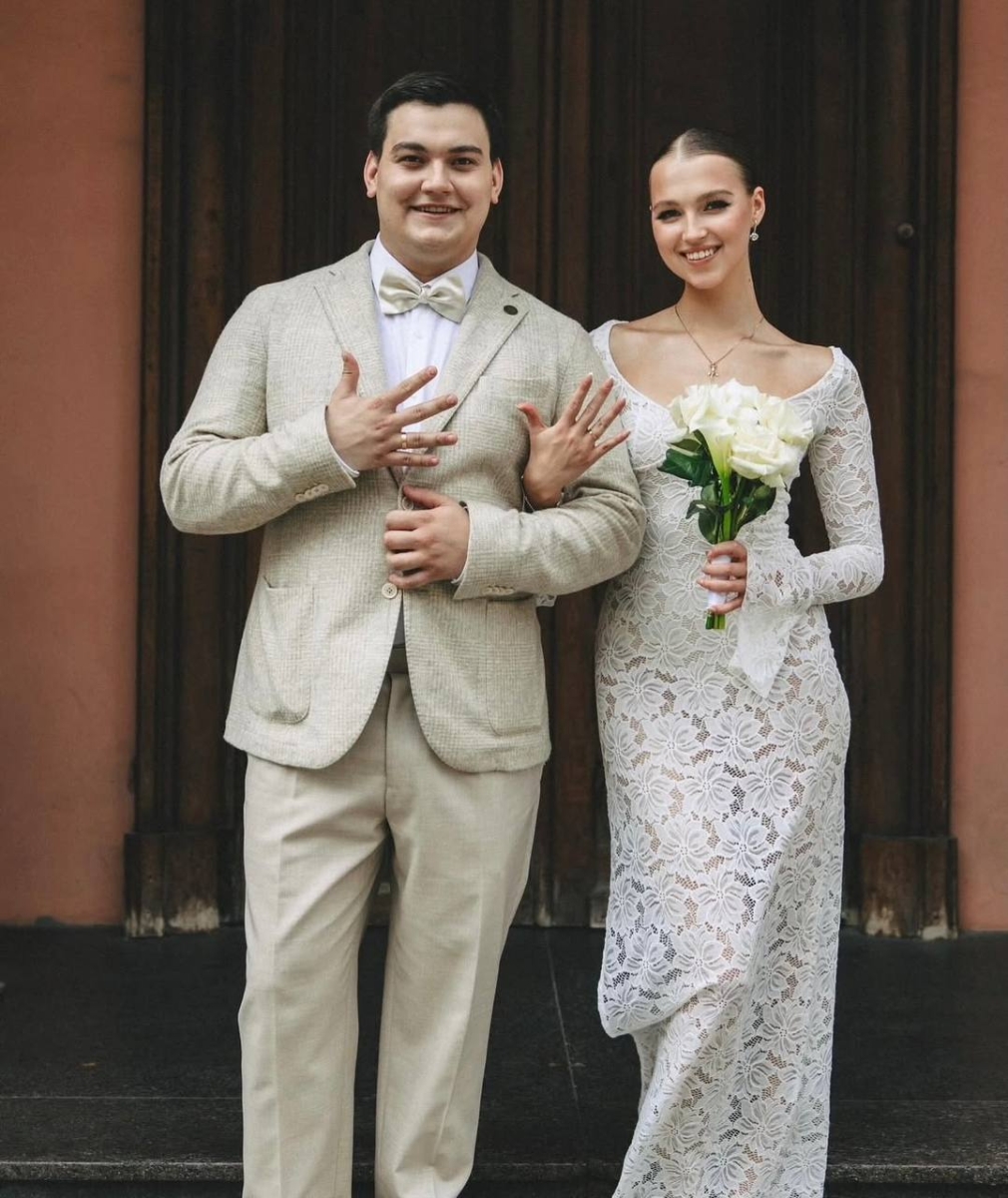 Лишь спустя два месяца молодожёны поделились фотографиями с торжества. Для свадьбы артист выбрал классический костюм светлого оттенка, дополнив образ модными кроссовками. Ульяна появилась в кружевном полупрозрачном платье с высоким разрезом.