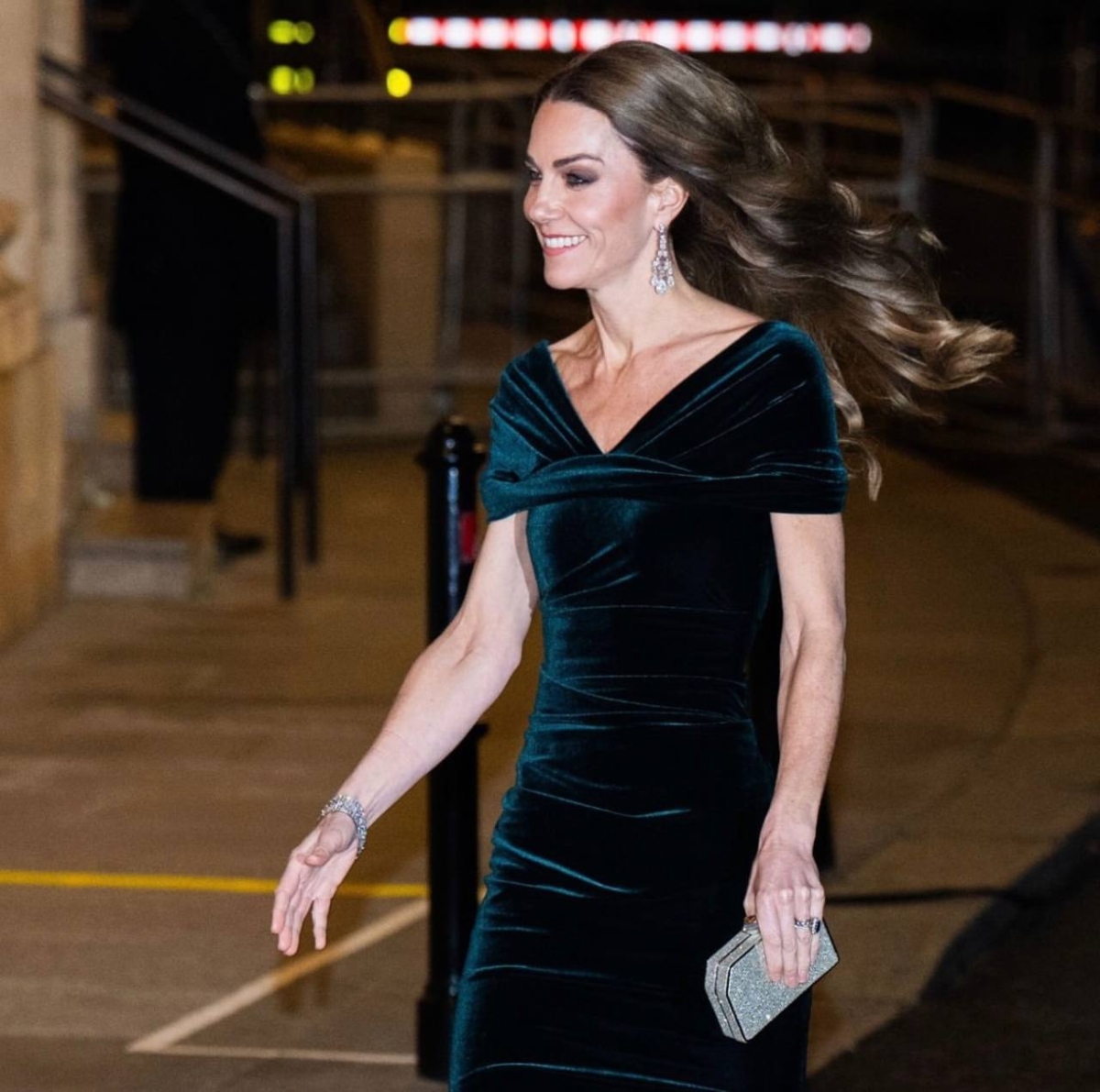 На Кэтрин было изумрудном платье из бархата с глубоким V-вырезом и силуэтом «рыбий хвост», предположительно от Talbot Runhof. В качестве аксессуаров она выбрала клатч Jenny Packham, алмазные серьги Greville, принадлежавшие покойной Елизавете II, и бриллиантовый браслет-колье королевы Мэри.