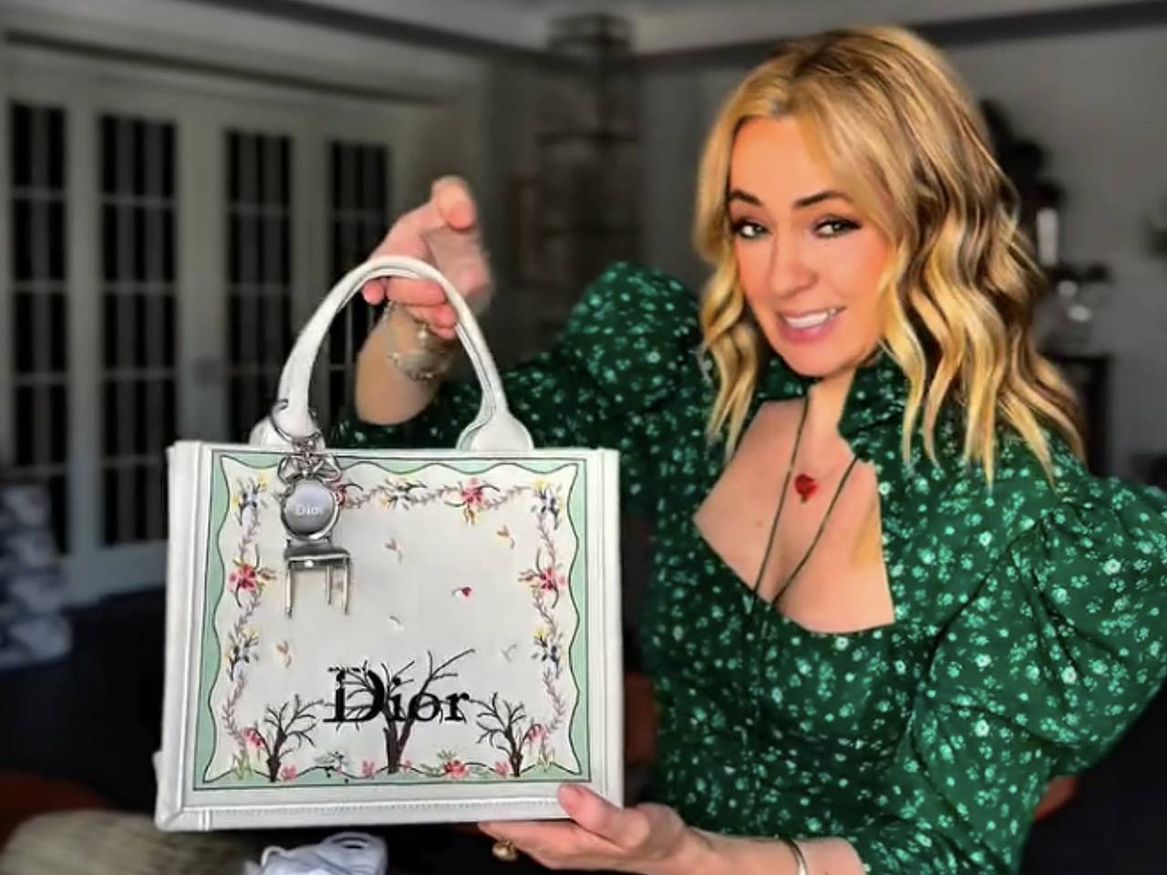 В кадре Рудковская, одетая в облегающее зеленое мини-платье и белые балетки, с нескрываемым восторгом открывает фирменную коробку с бантом. Внутри оказалась сумка-тоут модели Miss Dior из белой кожи, украшенная вышитым растительным орнаментом и изящным брелоком в виде стула.