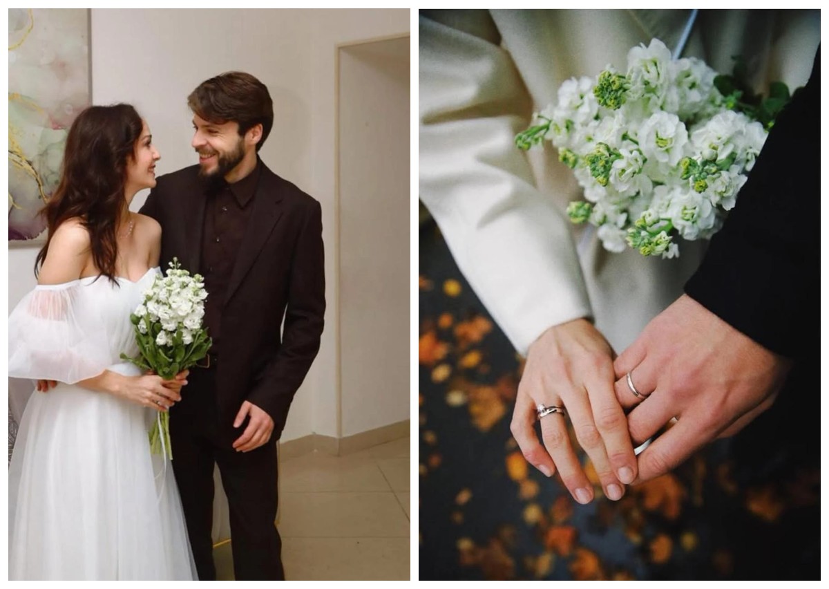 На фотографиях Валерия предстала в нежном белом платье с открытыми плечами, прозрачными пышными рукавами и лёгкой тюлевой юбкой. Её образ дополнили распущенные чёрные волосы, лёгкий макияж и букет из белых ранункулюсов.