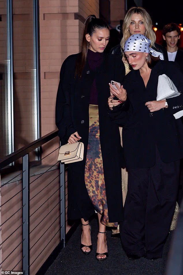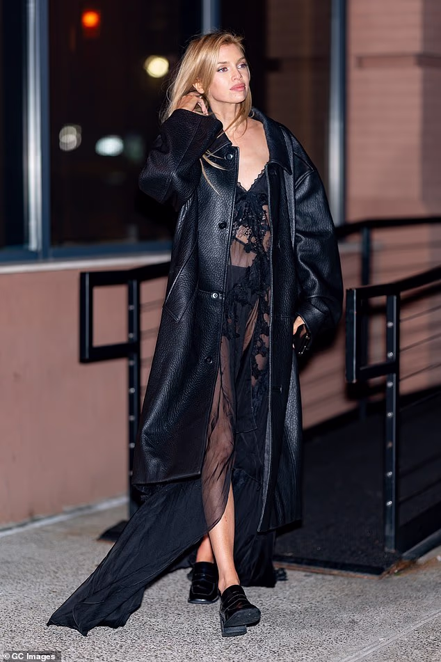 Stella Maxwel в черном полупрозрачном кружевном платье и тоже кожаном пальто.
