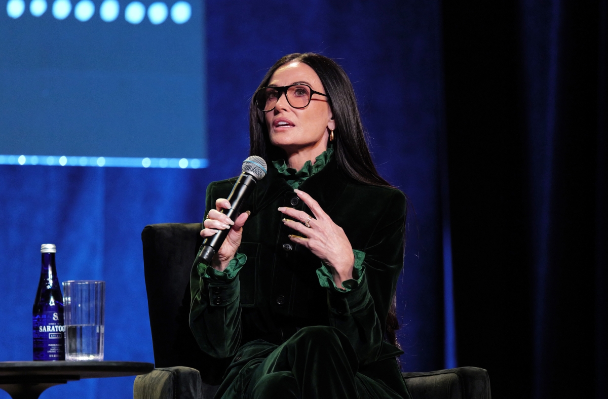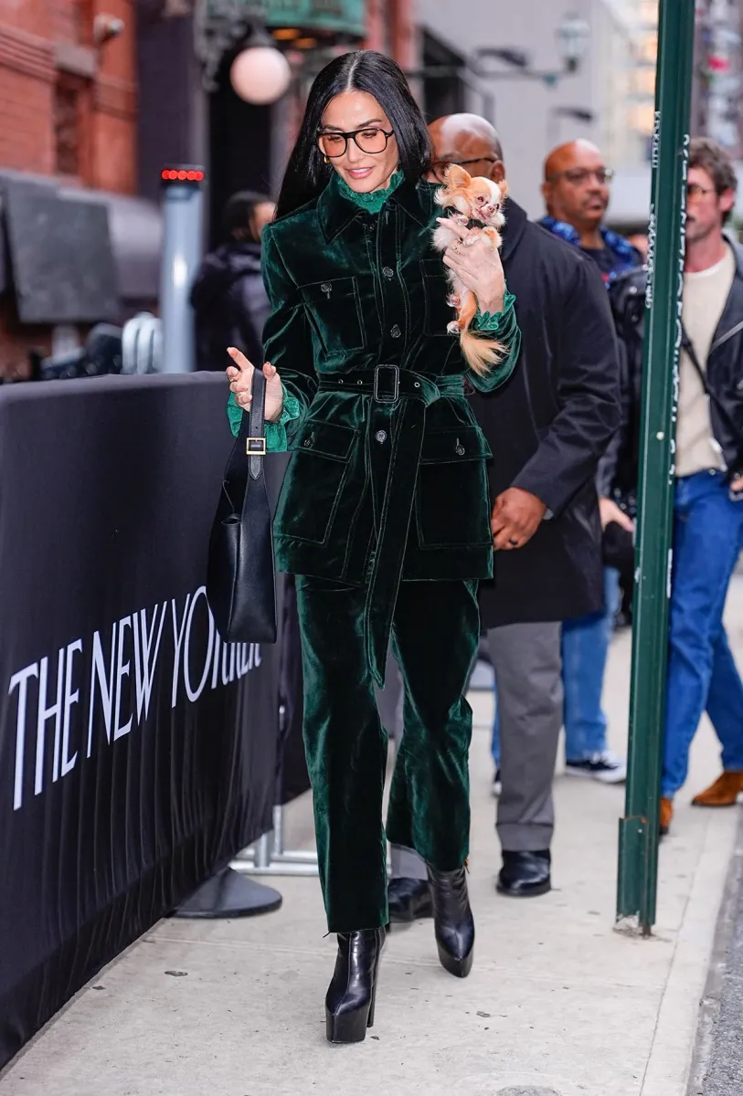 2025 год действительно был выдающимся годом для Деми Мур — как с точки зрения карьеры, так и с точки зрения моды — и ее появление на фестивале The New Yorker в субботу стало еще одним стильным событием. Деми вышла в изумрудно-зеленом бархатном костюме Saint Laurent Pre-Fall 2025 и блузке с оборками в тон. Плюшевый бархат, глубокий оттенок драгоценных камней, точный пошив — все это говорит о том изысканном, текстурном наряде, который определяет текущий сезон, когда все листья желтеют. Бархат в октябре кажется скорее свежим, чем праздничным. Стилист Brad Goreski заменил кожаный ремень, который был в лукбуке, на бархатный, и этим убирал военную нотку и придал элегантности. Этот образ, сочетающийся с любимой знаменитостями черной сумкой Saint Laurent LE 5 À 7 и высокими сапогами на платформе Nico, отражает все, что мы любим в Demi - элегантность и изысканность без суеты.
