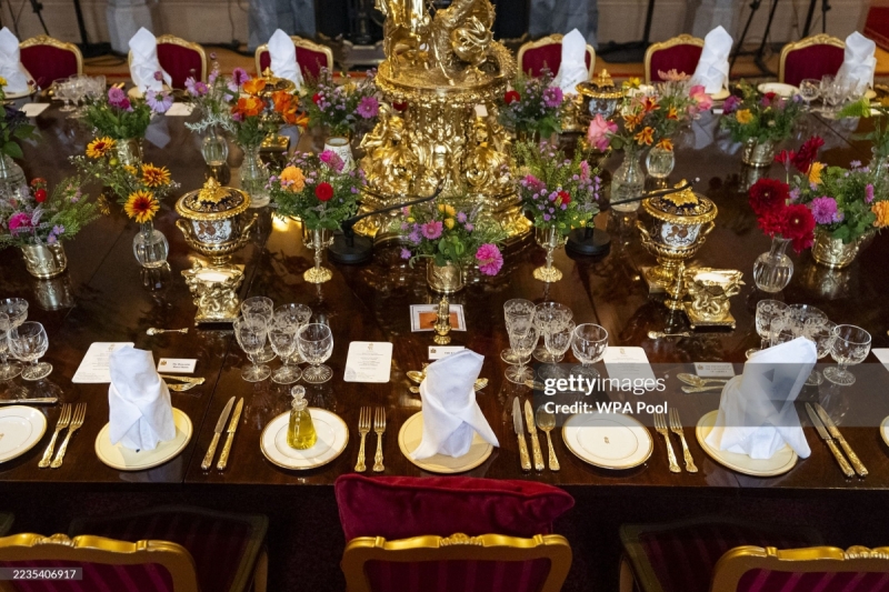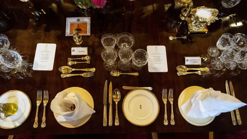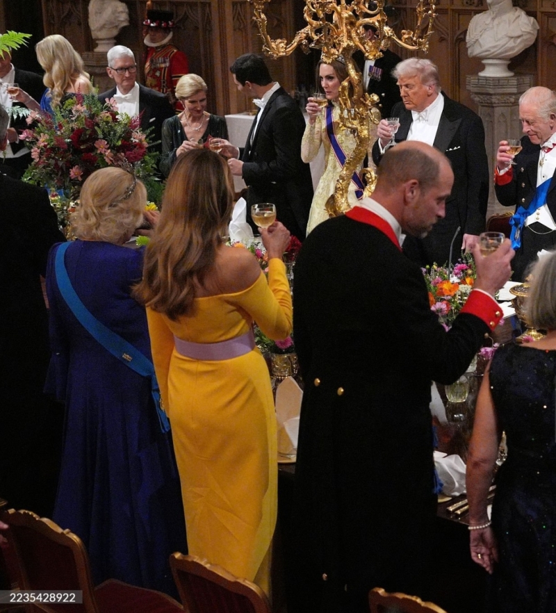 Так как визит очень важный, то королевская семья очень старалась. Банкет устроили в Зале святого Георгия в Виндзорском замке. Гостей было 160 человек, персонала 1500 человек. Французская кухня, коньяк 1912 года (в 1912 на шотландском острове Льюис родилась Мэри Энн Маклауд, будущая мать Дональда Трампа) и коктейль "Трансатлантический".