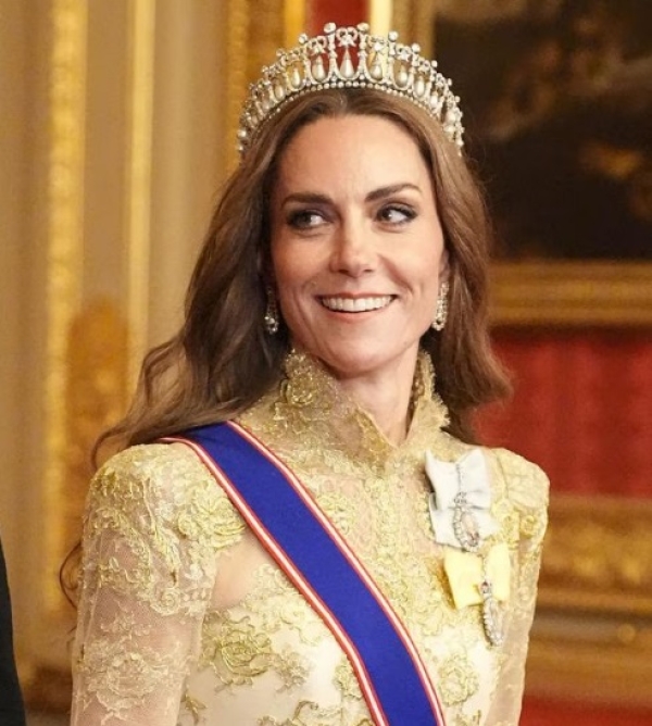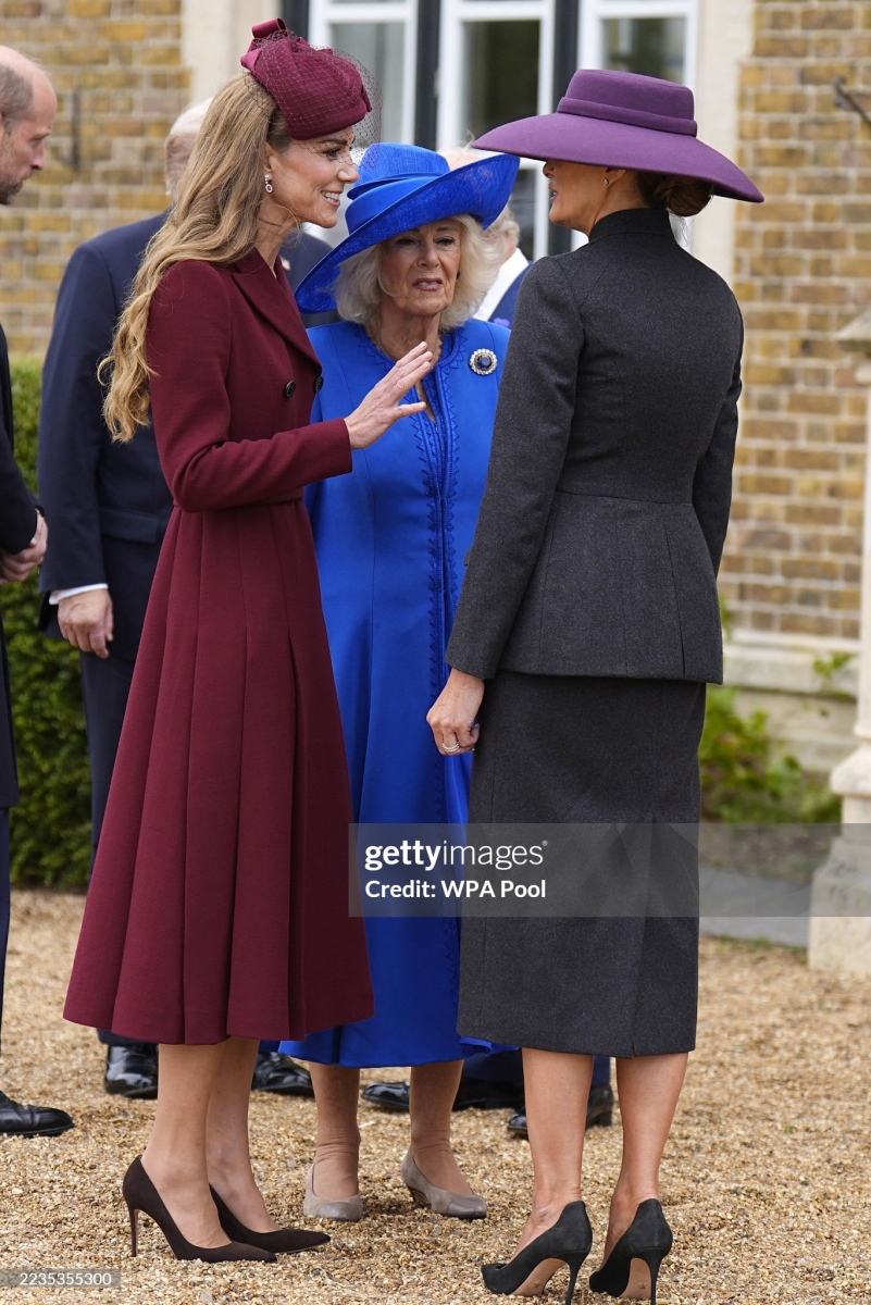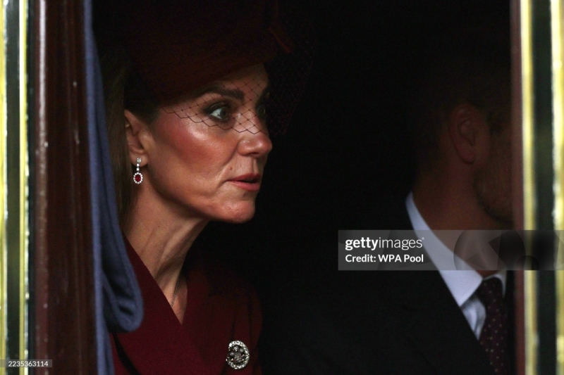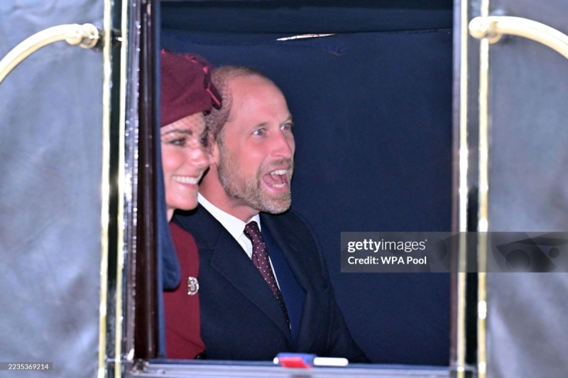 Кейт тоже закутали по горло, но, на мой взгляд, если платье с высоким воротом под подбородок (бежевое с золотом), то прическа должна быть собранной. И вот подумалось, уж если на фото она ТАКАЯ худая, то в жизни это совсем кости😬