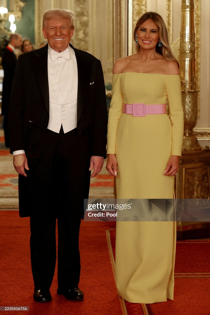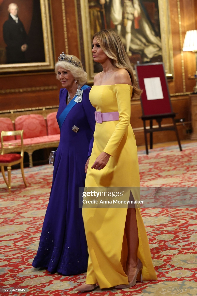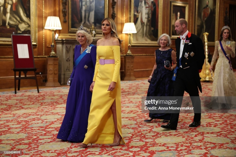 Вообще, по этикету негласному в ярком одеянии могла появляться только королева Елизавета, чтобы ее было видно везде и ее могли увидеть все. Поэтому ярко-желтый наряд Мелании вообще неуместен, она собой и своим платьем затмила королеву-консорт. Как-будто, она рулит этим балом. Можно было надеть приглушенные оттенки, чтобы оттенить хозяев.