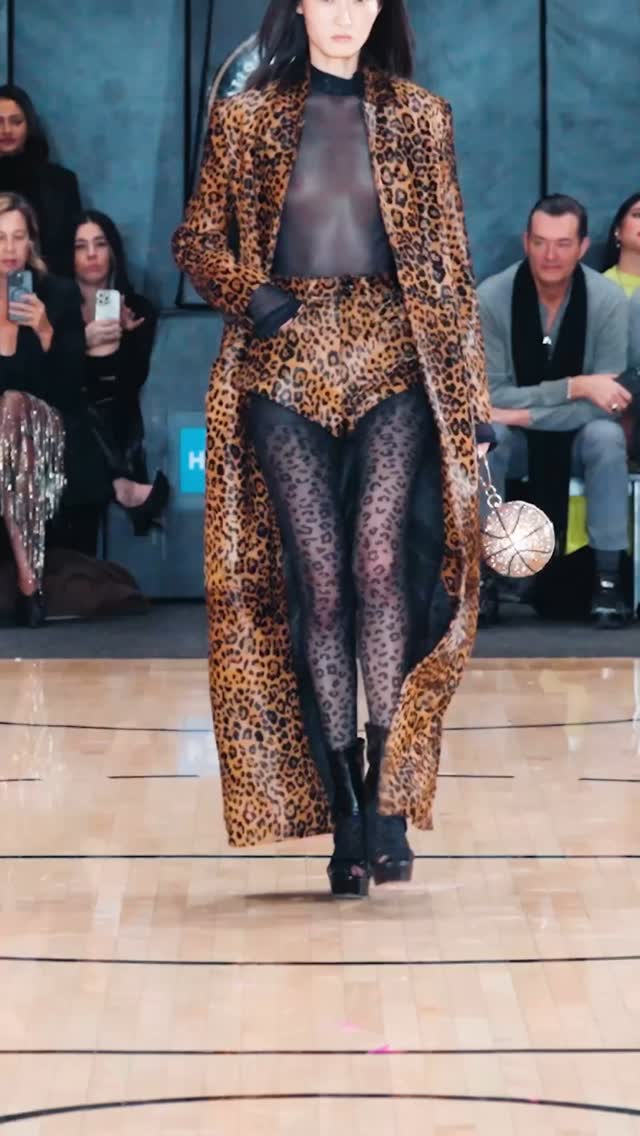 June Ambrose в тренче и шортах из телячьей кожи с принтом под леопарда из коллекции LAPOINTE FW25. Но нам жаль тех, кто сидел позади во время показа.