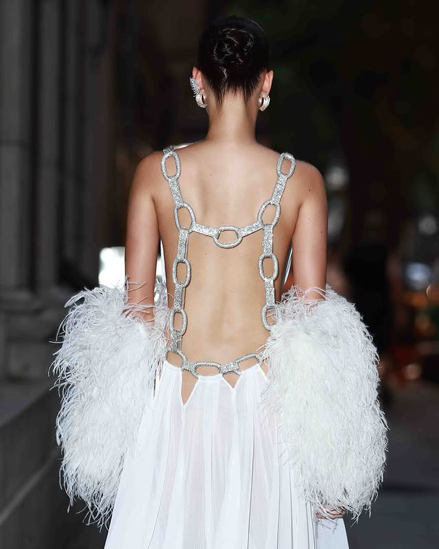 Британская актриса Jodie Turner-Smith в нестареющем архивном изделии Georges Chakra Couture из коллекции Весна/Лето 2005. На первый взгляд кажется, что это мечтательное платье, украшенное кружевами. Но под расшитым скульптурным жакетом из шелковой органзы, изысканно скроенным струящимися вставками с рюшами, расклешенными манжетами и замысловатой серебряной вышивкой открывается расшитый жемчугом Swarovski боди, который был одновременно смелым и нежно роскошным. Если боди кажется немного откровенным, то мы помним, что это было мероприятие, посвященное нижнему белью и Джоди была более прикрыта, чем модели, которые ходили по подиуму. Ее статная уравновешенность и врожденный гламур могла бы стать частью актерского состава шоу. Завершив ансамбль драгоценностями Chopard Джоди в очередной раз продемонстрировала свое умение одеваться по случаю.