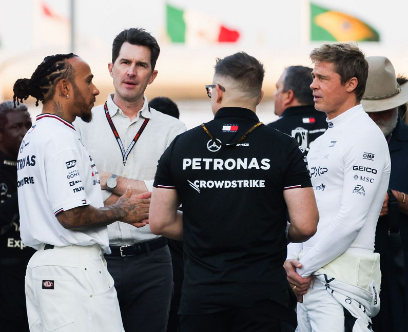 Льюис Хэмилтон и Брэд Питт на съёмках фильма