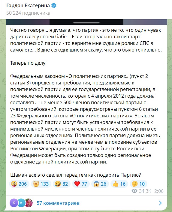 Ярослав Дронов, более известный под псевдонимом Шаман, подарил своей возлюбленной Екатерине Мизулиной ... партию 🙈🙈🙈