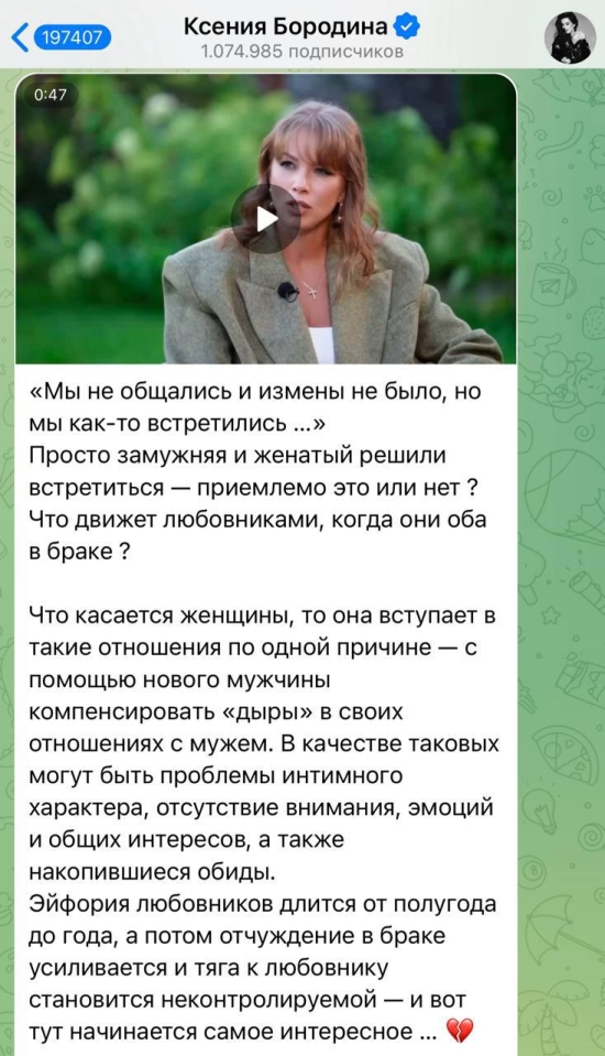 Ксения Бородина подробно описала, как, по её наблюдениям, развиваются подобные ситуации: “Эйфория любовников длится от полугода до года, а потом отчуждение в браке усиливается и тяга к любовнику становится неконтролируемой”.