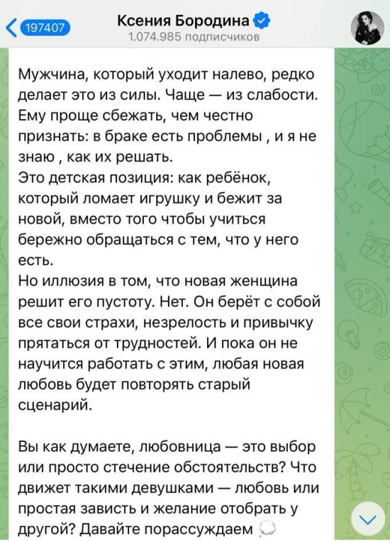 Бородина теперь дипломированный психолог, правда на занятиях ее не видели. Но открыла свой ю-туб канал и теперь новый источник заработка. Предыдущий муж хоть что-то зарабатывал (строительный бизнес семейный был). А нынешний муж-блохер на полном финансовом обеспечении Бородиной. Накормить, одеть, развлекать, возить на экскурсии по станам мира - на все деньги нужны. Вот и приходится вертеться. Ксении налево точно не будет времени ходить. Она просто разведется и возьмет новую пассию на содержание.