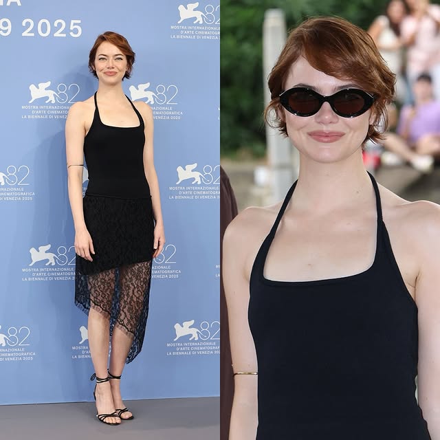 Emma Stone на фотосессии Венецианского кинофестиваля в черном платье Louis Vuitton с ассиметричной кружевной юбкой. На первый взгляд, это выглядит немного пляжно — как будто Эмма только что искупалась в Адриатике, взяла шикарную накидку и отправилась прямо на фотосессию. И тем не менее, это работает. Стиль был сведен к минимуму с помощью босоножек Manolo Blahnik Leva с ремешками, браслета Elsa Peretti® Snake и сережек-кафф Louis Vuitton, которые придали современный вид.
