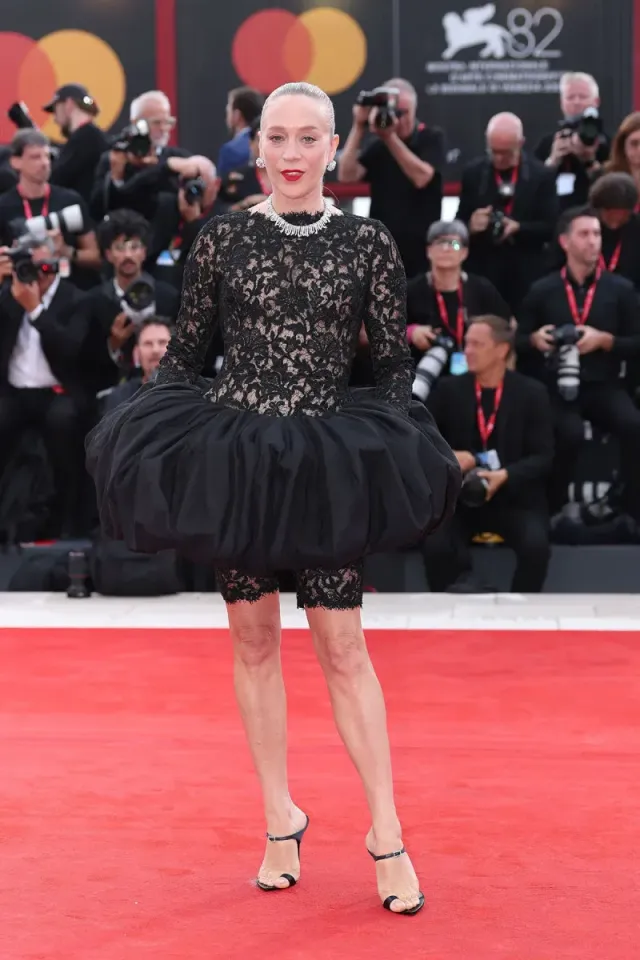 Chloë Sevigny на фотосессии "After The Hunt" во время Венецианского кинофестиваля. Актриса была одета в топ и юбку с метким названием Unraveling Ribbon из коллекции Simone Rocha 2025. Атласные ленты на шнуровке, которые кажутся намеренно распутывающимися. Потертые края, тонкие детали придали Хлое тот легко разрушенный шик, который у нее так хорошо получается.