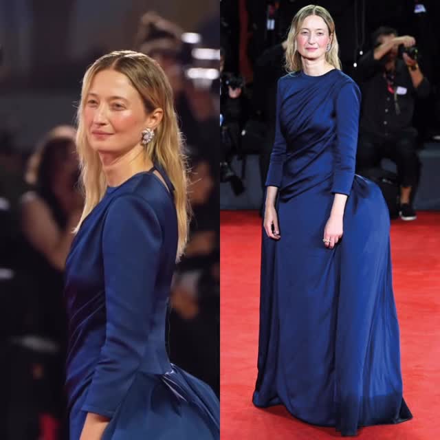 Alba Rohrwacher в темно-синем атласном платье Dior Haute Couture (первое от Jonathan Anderson) с драпированным лифом.