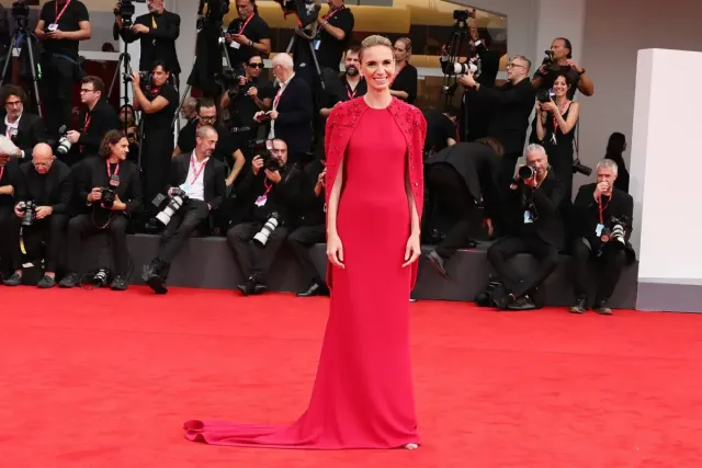Emanuela Fanelli для своего выхода на красную дорожку на 82-м Венецианском международном кинофестивале выбрала один из самых утонченных и сценографических образов сезона. Актриса была одета в платье от Alberta Ferretti, которое сочетает в себе театральность, элегантность и царственный оттенок. Силуэт представляет собой платье-накидку, в котором рукава, построенные как верхняя одежда, обхватывают руки плавным и структурированным движением одновременно. Бретели украшены кристаллами тон в тон и пайетками, которые освещают лицо и дарят свет всему наряду без излишеств. Но именно на спине платье раскрывает свои неожиданные детали: вырез-иллюминатор, элегантно обрамляющий спину, и легкий шлейф, который сопровождает каждый шаг изяществом и сценическим присутствием. Также имеет значение королевский красный оттенок, интенсивный и яркий.