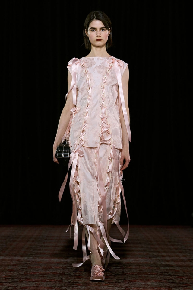 Топ и юбка «Unraveling Ribbon» изготовлены из потертых полосок цветочной парчи, скрепленных атласными шнурками, обнажающими швы из грогрена.
