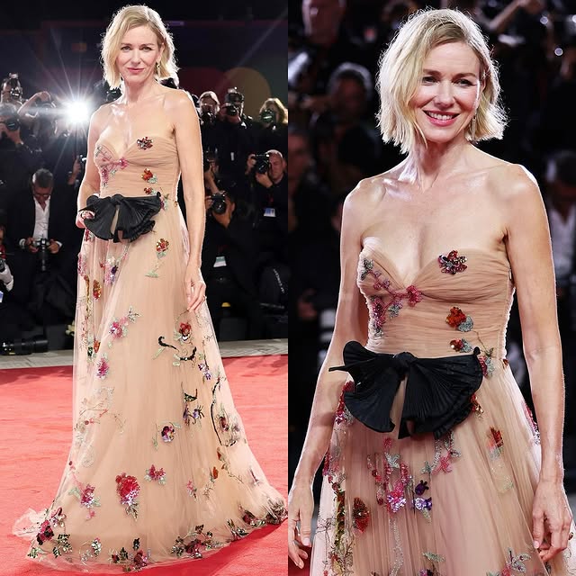 Naomi Watts в платье Valentino на премьере фильма ‘Jay Kelly’ в платье из тюля без бретелек от Valentino светлых тонов, созданном креативным директором Alessandro Michele. Цвет был мягким и романтичным, но именно фирменные украшения, разбросанные как конфетти по ткани, по-настоящему оживили платье. Без них она рисковала скатиться к «красивому, но забываемому». С ними это стало игривым и причудливым.