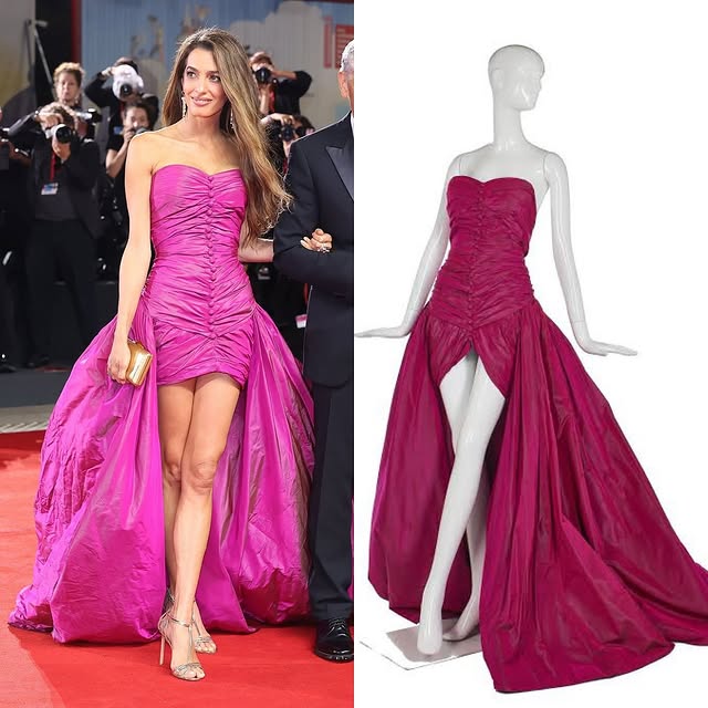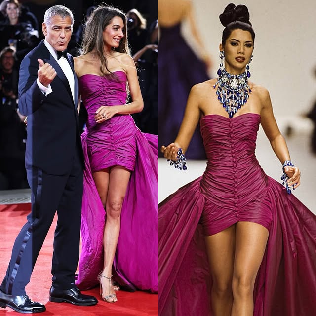 George Clooney и Amal Clooney посетили премьеру фильма  “Jay Kelly” на Венецианском кинофестивале, представив совершенно разные взгляды на стиль красной ковровой дорожки. Джордж выглядя остро в темно-синем смокинге Giorgio Armani. Атласные лацканы, безупречный пошив, непринужденная уверенность — все это делал Армани то, что у него получается лучше всего. Амаль заглянула в свой любимый винтажный архив за этим платьем Jean-Louis Scherrer от Erik Mortensen сезона осень-зима 1995-96. Амаль удалось найти баланс между винтажным шармом и неподвластной времени изысканностью.  Но между смелым блеском, объемной юбкой и чересчур ностальгическим силуэтом он казался скорее «королевой выпускного вечера 80-х», чем вечным винтажем. Проблема не в самой тафте, а в том, как цвет и структура соединились таким образом, что они выглядели устаревшими, а не восхитительно ретро. Что касается аксессуаров, она носила клатч Jimmy Choo Clemmie и босоножки Aquazzura Forever More.