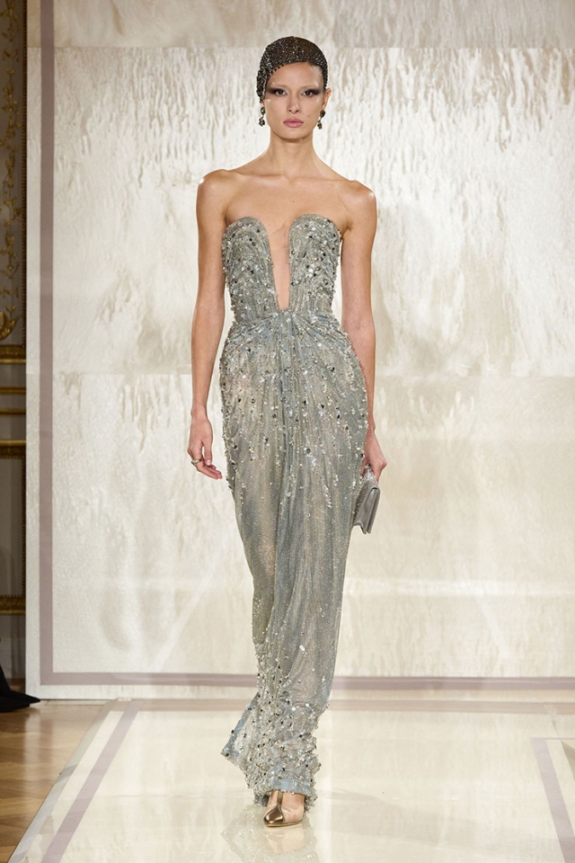 Emanuela Fanelli в серебристом платье без бретелек от Armani Privé с металлическим отливом, усыпанное пайетками и сверкающими микроаппликациями, которые под огнями Lido создавали блестящий и переливающийся эффект. Модель, бюстье без бретелек с глубоким V-образным вырезом, подчеркнула силуэт с чрезвычайной элегантностью. Драпированная талия и струящаяся ткань добавили движения и легкости, превращая каждый шаг на красной дорожке в игру отражений. Был создан сценический эффект, способном сочетать в себе голливудский гламур и итальянскую утонченность. Для завершения образа украшения от Cartier: бриллиантовое колье с чокером, подходящие серьги и тонкий браслет от великого Дома высокого ювелирного искусства. Отблески камней соседствовали с отражениями платья, умножая свет вокруг нее и делая ее настоящей героиней вечера.