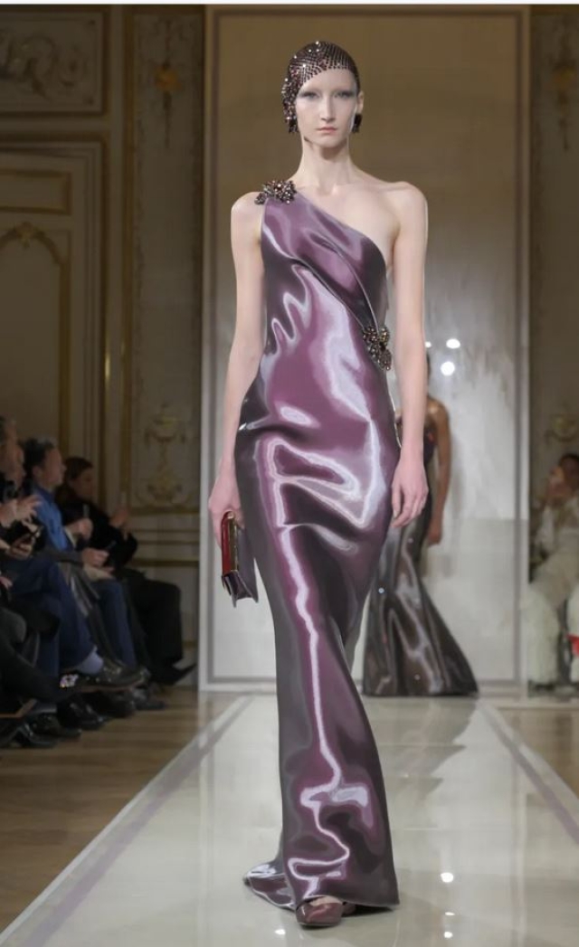 Gemma Chan в платье Armani Privé Spring '25 Couture. Неудивительно, ведь это одноплечевое платье, которое вызвало восторг еще в январе, как мерцающая жидкость, выливающаяся на пол, со сверкающими красными акцентами драгоценных камней на плече и талии.