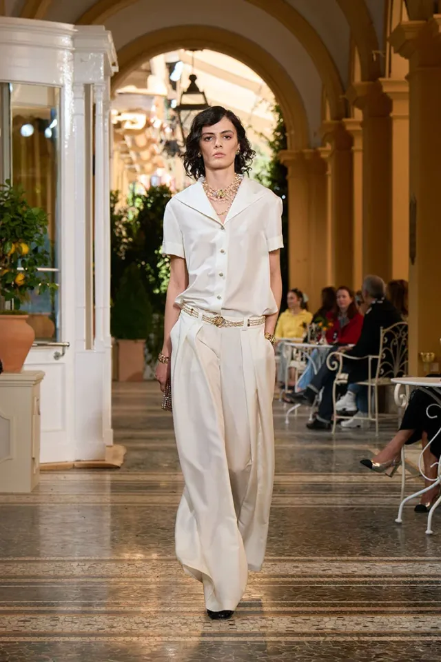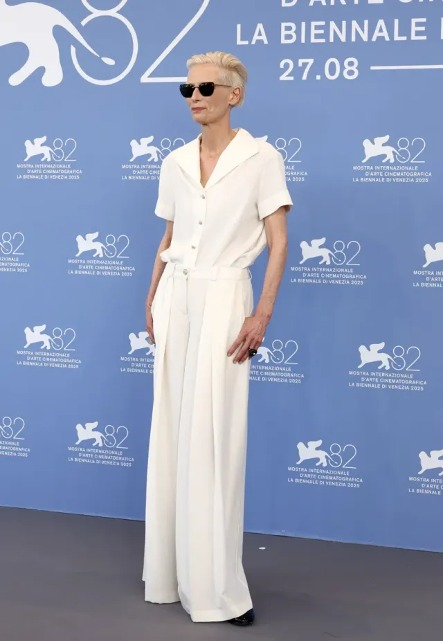 Tilda Swinton в Chanel Resort 2026. Тильда показала чистый сдержанный шик в рубашке из шелка цвета слоновой кости и брюках в тон, которые были свободными, воздушными и созданы для венецианского солнца. В сочетании с солнцезащитными очками и парой черных туфель-лодочек (к счастью, едва заметных под брюками) весь образ был непринужденно элегантным.