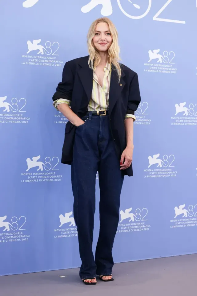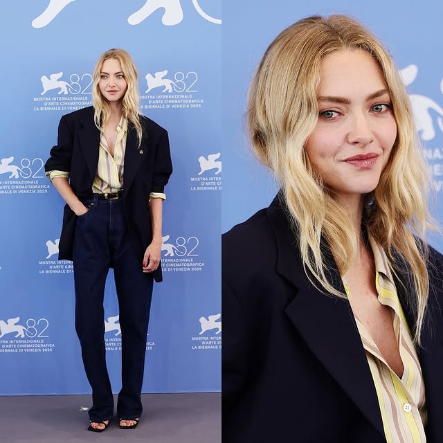 Amanda Seyfried на фотоколле фильма ‘The Testament Of Ann Lee’ в Versace. Поскольку Аманда делит своего стилиста Elizabeth Stewart с Джулией Робертс, то это привело к игривому моменту на выходах. Когда стилист опубликовала в соцсети фотографию Джулии в стиле Versace, Аманда быстро прокомментировала: «Пожалуйста, позволь мне надеть такой же наряд». Желание исполнилось на показе в Sala Grande. Это очаровательный момент пересмотра моды, который Элизабет любит отстаивать. Но вот в чем загвоздка: рост Джулии 5 футов 9 дюймов (175 см), а рост Аманды — 5 футов 3 дюйма (160 см). На Джулии это было сшито идеально, так как это был индивидуальный образ. На Аманде джинсы — поднятые так высоко, как только могли, — все равно были слишком длинными. Пропорции не были идеальными, но энтузиазм Аманды выдержал это. Она носила образ с радостью, как младшая сестра, совершающая набег на гардероб своей старшей сестры — и это часть веселья.