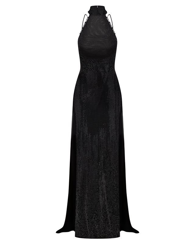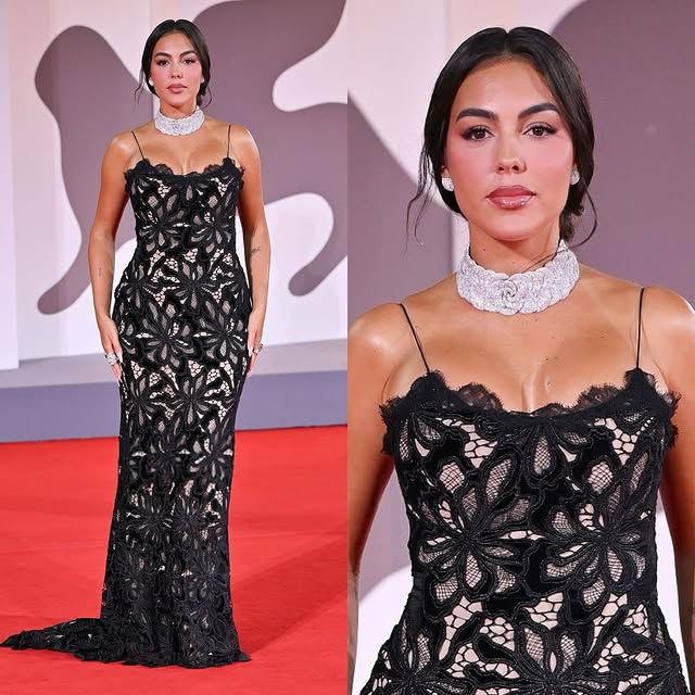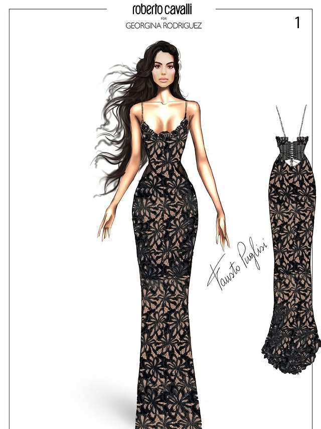 Недавно помолвленная Georgina Rodriguez сама, без стилиста работала непосредственно с итальянским дизайнером Fausto Puglisi над этим индивидуальным творением Roberto Cavalli — черным бархатным кружевным платьем-комбинацией из макраме, которое, на первый взгляд, кажется очень верным ее любви к гладким, облегающим силуэтам. Джорджина, как и Ким Кардашьян, тяготеет к знойным, изгибающимся дизайнам, поэтому концепция абсолютно подходит ей. На эскизе это платье было удачной идеей. Ожидалось, что нижний слой будет идеально подобран к оттенку ее кожи. Вместо этого контраст цвета притупил часть магии и иллюзии голого платья. Украшения Pasquale Bruni, в том числе ювелирный чокер Rosina из белого золота 18 карат с бриллиантами, рубинами и розовыми сапфирами, а также ослепительный набор колец завершили ее образ, но, конечно, самым ярким украшением остается ее мега-помолвочное кольцо от жениха Криштиану Роналду, которое затмило все остальное.