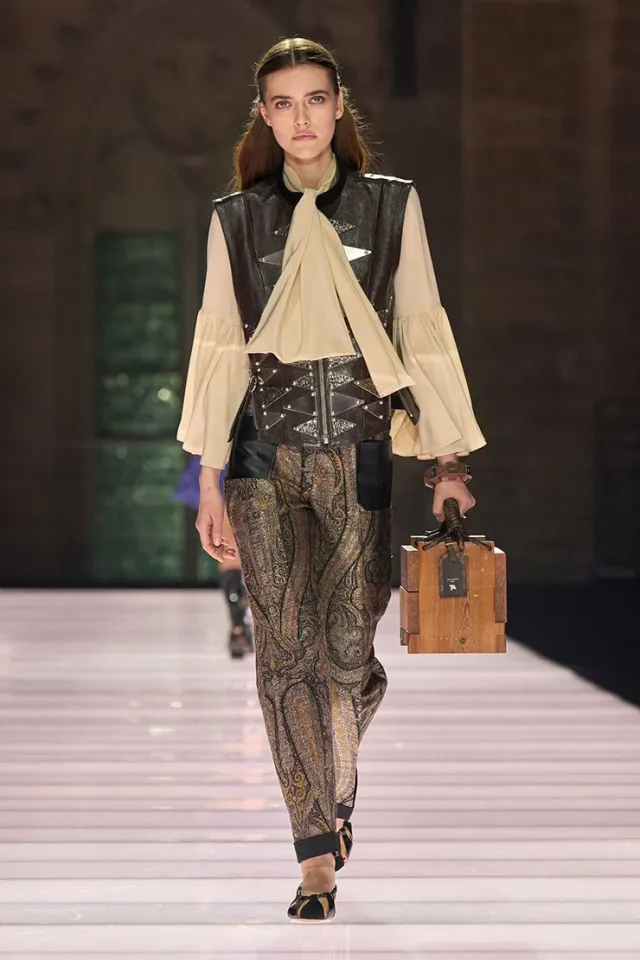 Cate Blanchett на фотосессии фильма «Father Mother Sister Brother» в образе Louis Vuitton Resort 2026. Глядя на подиумную версию этого образа видно, что Кейт отредактировала его. Она оставила только кожаный жилет, расшитый металлическими пластинами и заклепками, и сочетала его с острыми черными плиссированными брюками и гладкими кожаными туфлями-лодочками. Оригинальный стиль подиума — брюки с пейсли и блузкой — казался немного капитаном Джеком Воробьем, но Кейт вернула его к чему-то современному, отполированному и полностью своему.