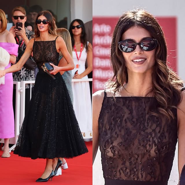 Kaia Gerber в черном кружевном платье Givenchy Spring 2026 от Sarah Burton, украшенное пайетками, с мотивами ландыша, которые сверкали в свете и смотрелись романтично. Гладкий клатч от Givenchy в руке, классические туфли-лодочки Repetto Cendrillon на ногах — это был образ, который шептал элегантностью. Вместе Кайя и Льюис достигли неуловимого голливудского баланса: отполированного, но расслабленного, модного, но не суетливого.