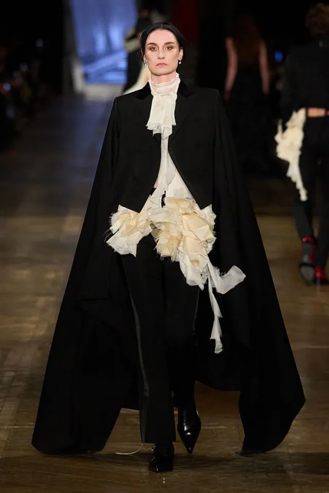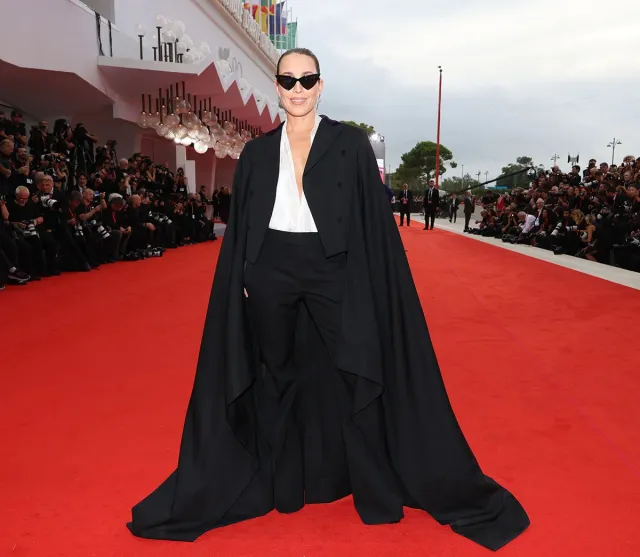 На премьере Кейт в образе Maison Margiela Artisanal 2025. Она сочетала лаконичный черный топ с потертыми краями с юбкой, украшенной сложным коллажем из натюрмортов, создававших впечатление «оперения», дополненным аппликацией в виде крыльев, изготовленной из той же ткани. Этот образ словно балансировал между модой и искусством, между движением и статикой. Кейт умеет создавать гламур, драму и авангард в одном лице. Черные сапоги Maison Margiela из кожи Tabi Claw на танкетке Perspex завершили ее образ.