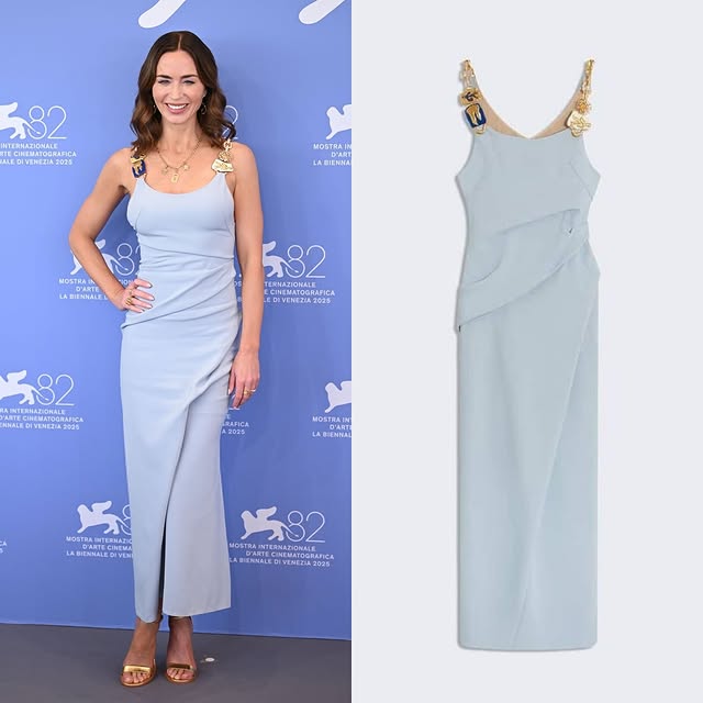 Emily Blunt на фотосессии в пудрово-голубом платье Schiaparelli. Даже для фотосессии это платье было эффектным, благодаря фирменным золотым ремешкам с скульптурной фурнитурой, инкрустированной стразами цепями Schiaparelli. Облегающий силуэт также мог похвастаться драпировкой спереди для дополнительного интереса. Металлических золотые босоножки Cadey Lee от обувного бренда Schutz с узкими ремешками на пальцах ног и пряжкой вокруг лодыжки сочетались с цепями. Она подняла ставки с помощью золотого ожерелья с шармом и висячих серег геометрической формы.