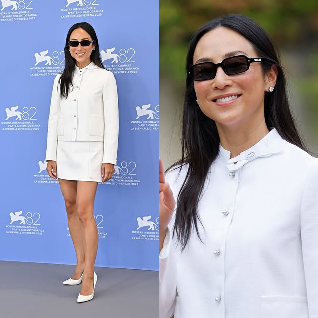 Greta Lee вступила в ряды Dior, дебютировав в нескольких образах на Венецианском кинофестивале 2025 года, продвигая свой новый фильм «Late Fame». Появления Греты предполагают, что она станет «женщина Dior» под руководством Джонатана Андерсона. На фотосессии Грета проявила свой фирменный возвышенный минимализм в белом жакете Dior, украшенном нежным серебряным жемчугом, с бантом в вырезе и тонкой деталью CD. В сочетании с подходящей юбкой, отмеченной сдержанным штампом Dior на подоле, это была тихая роскошь в лучшем виде. Стилизованный просто с белыми туфлями-лодочками, весь образ был чистым, современным и шикарным.