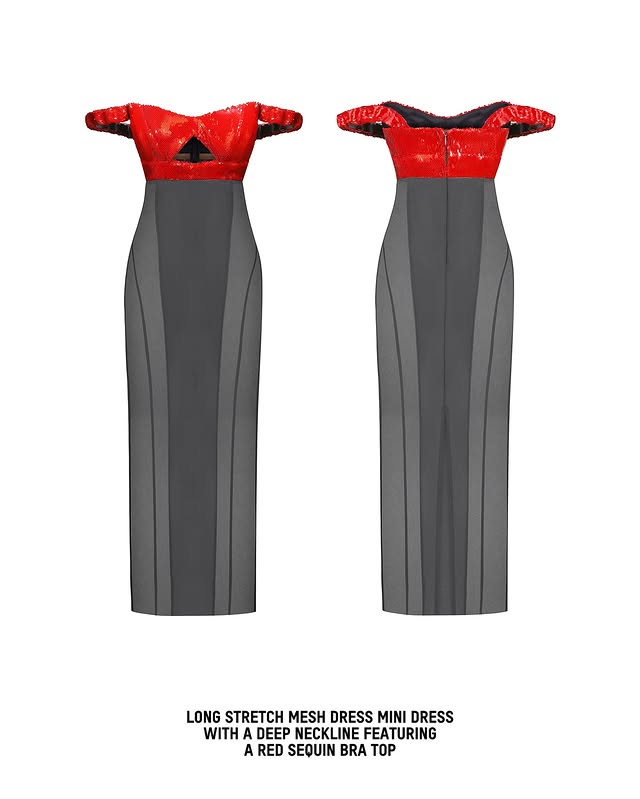 Еще один выход в полупрозрачном платье с алым корсетом и облегающей серой юбкой этого же бренда.