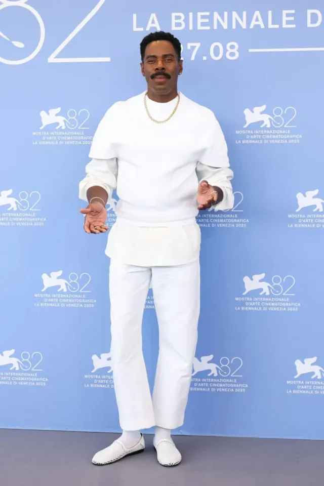 Colman Domingo скрасил фотоколл своим полностью белым образом Jacquemus Spring 2026, который был мастер-классом по балансу: острые линии свитшотов, слоистая рубашка и обрезанные брюки, которые были слишком короткими, но скрашенными носками. Плетенные слипоны и золотые цепи запечатали сделку, заставив весь внешний вид чувствовать себя свежим, уверенным и именно таким венецианским моментом, который все запомнят и возьмут как тренд.