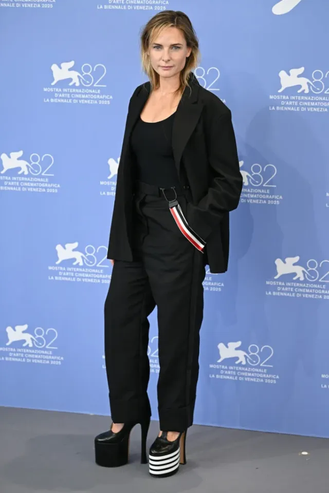 Rebecca Ferguson на фотоколле в костюме Thom Browne. Расслабленный пошив ожил с фирменными полосками Thom Browne и этими туфлями с высокими платформенными каблуками из коллекции осень 2025 года. Взгляд на моду - расслабленный по духу, но умный в деталях.
