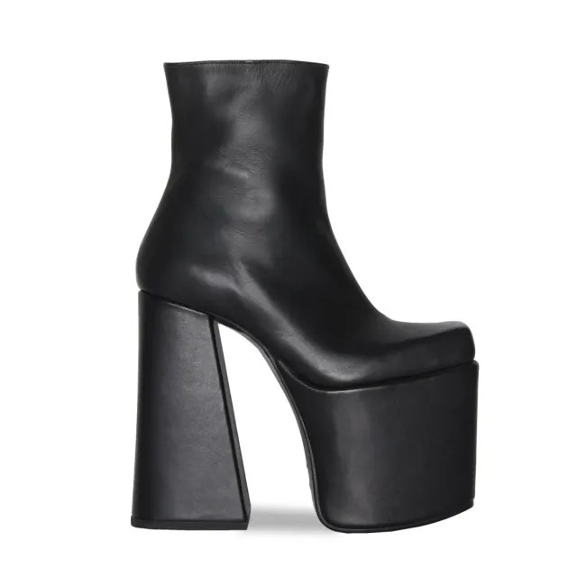 Кожаные ботинки с квадратным носком-футляром "Highbury" из ателье ROKER's в Лондоне за £620.00 с каблуком 19 см и платформой 10 см из итальянской кожи ручной работы изготавливается на заказ; обычно на изготовление обуви вручную уходит 4 недели.