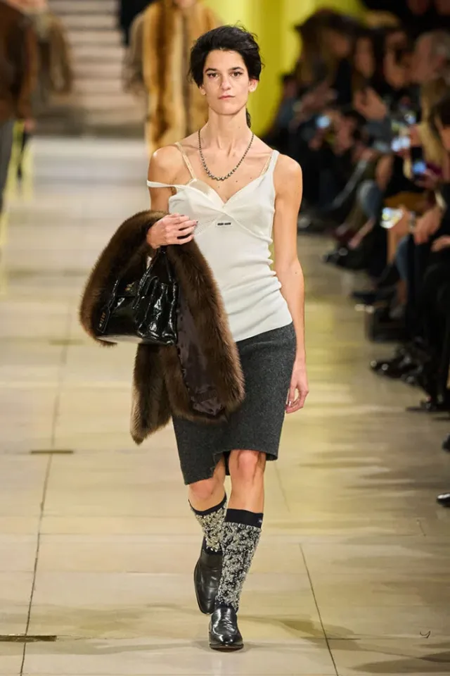 На фотоколле в Miu Miu Spring 2025 - трикотажный бандо, юбка-карандаш и лаковые туфли, которые технически не должны работать вместе - и все же, на ней происходит энергия встречи гранжа и девичества. Можно назвать "The Glamour Switch-Up".