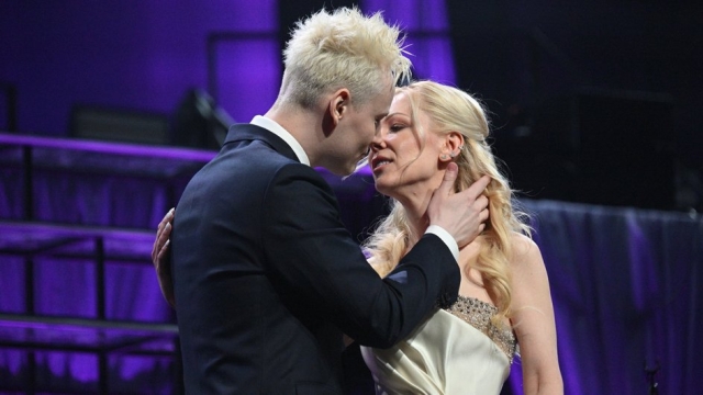 На видео блогерша обнимает мужа и танцует с ним среди сверкающих янтарных панелей.