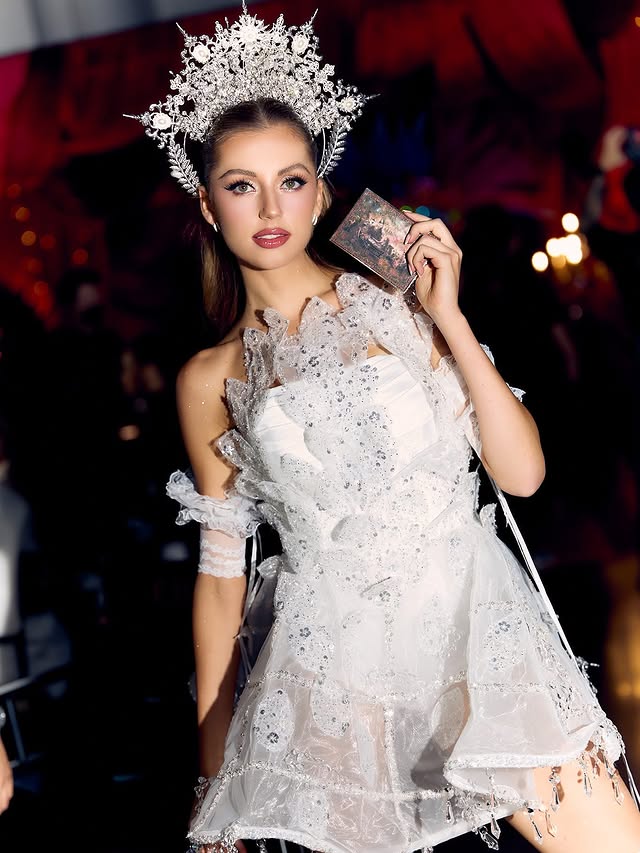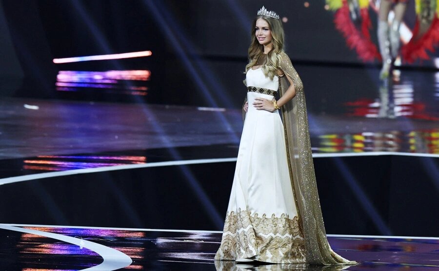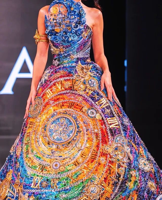Мисс Сербия красавица из Якутии Елена Егорова в платье, которое зрители сначала приняли за «космическое платье». При ближайшем рассмотрении стало ясно: это не просто сценический наряд, а тончайшая ювелирная работа. Платье полностью инкрустировано камнями и кристаллами, расшито сложной авторской вышивкой из хрустальных стразов и бисера. На груди расположена композиция, напоминающая корабль, плывущий по волнам, а по подолу — элементы, похожие на движущийся поезд и города Белграда. Платье мерцало при каждом ее шаге, и каждый раз, когда 28-летняя девушка поворачивалась, становилось видно все больше деталей. Позже создатели объяснили символику костюма. Главная его идея — «астрономические часы», представляющие течение времени. Монастырские мотивы платья отсылают к Белграду и православным традициям Сербии, волны и звезды символизируют Дунай, а золотые узоры — свет и надежду. Переход цвета отражает путь страны к силе и росту, а поезд внизу подола — движение вперед и прогресс. На фоне других костюмов, построенных на масштабных конструкциях и сложных механизмах, образ Елены мог показаться менее эффектным по объему, но внимательные зрители и подписчики отметили: по художественному исполнению он выглядит впечатляюще и вполне заслуживает статуса произведения искусства. Егорова — наставница и оратор, владеющая сербским, английским, русским и французским языками.