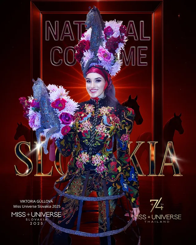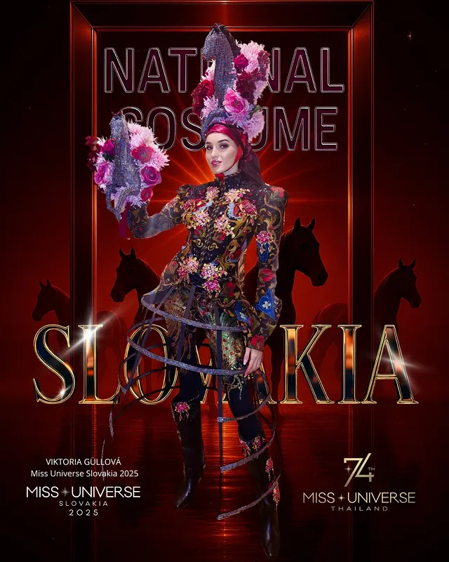 Мисс Словакия Виктория Гуллова в национальном костюме, созданным в честь одного из самых ценных символов словацкого наследия — лошади. На протяжении веков лошадь была символом силы, свободы и гармонии между людьми и природой, глубоко вплетённый в сердце истории Словакии. Этот изысканный костюм показывает эту связь. Её куртка выполнена в духе исторической, расшитой одежды для езды на лошади, превращённой в произведение искусства, соединяющее традиции с современной элегантностью. Дизайн с его земляными и металлическими оттенками передаёт движение, силу и грацию этого благородного животного. Мисс воплощает эту гармонию через свою любовь к верховой езде и преданность канистерапии, помогая детям и взрослым находить силу и покой через исцеляющую связь с животными. Этот костюм — не просто творение, а дань стойкости, красоте и гордой душе Словакии.