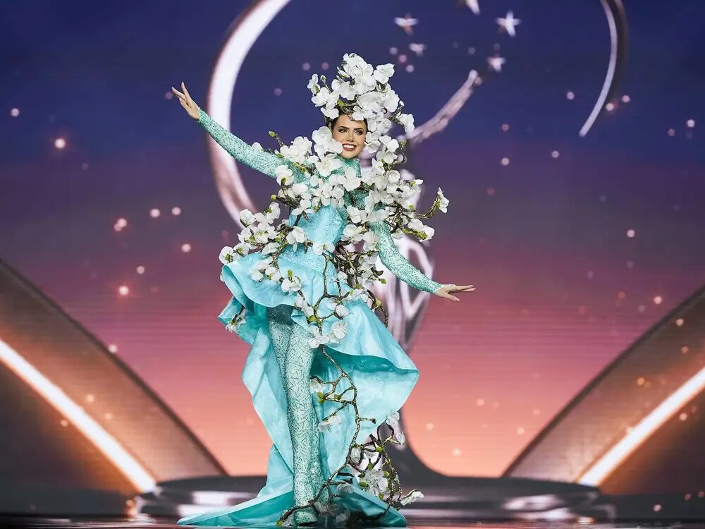 Мисс Казахстан Дана Алмасова в платье из шелка и войлока, украшенного тюльпанами, которое стало символом безграничных тюльпановых полей, украшающих казахстанские степи. «Мне бы очень хотелось, чтобы казахстанские тюльпановые поля стали такими же известными, как лавандовые во Франции. Эта неповторимая красота заслуживает восхищения во всем мире. Каждый тюльпан, каждая деталь — о женщинах Казахстана — сильных, тёплых и вдохновляющих», – поделилась Дана. По словам Даны, наряд стал для неё не просто эффектным сценическим образом, но и «маленькой историей о том, как всё великое начинается с нежности».