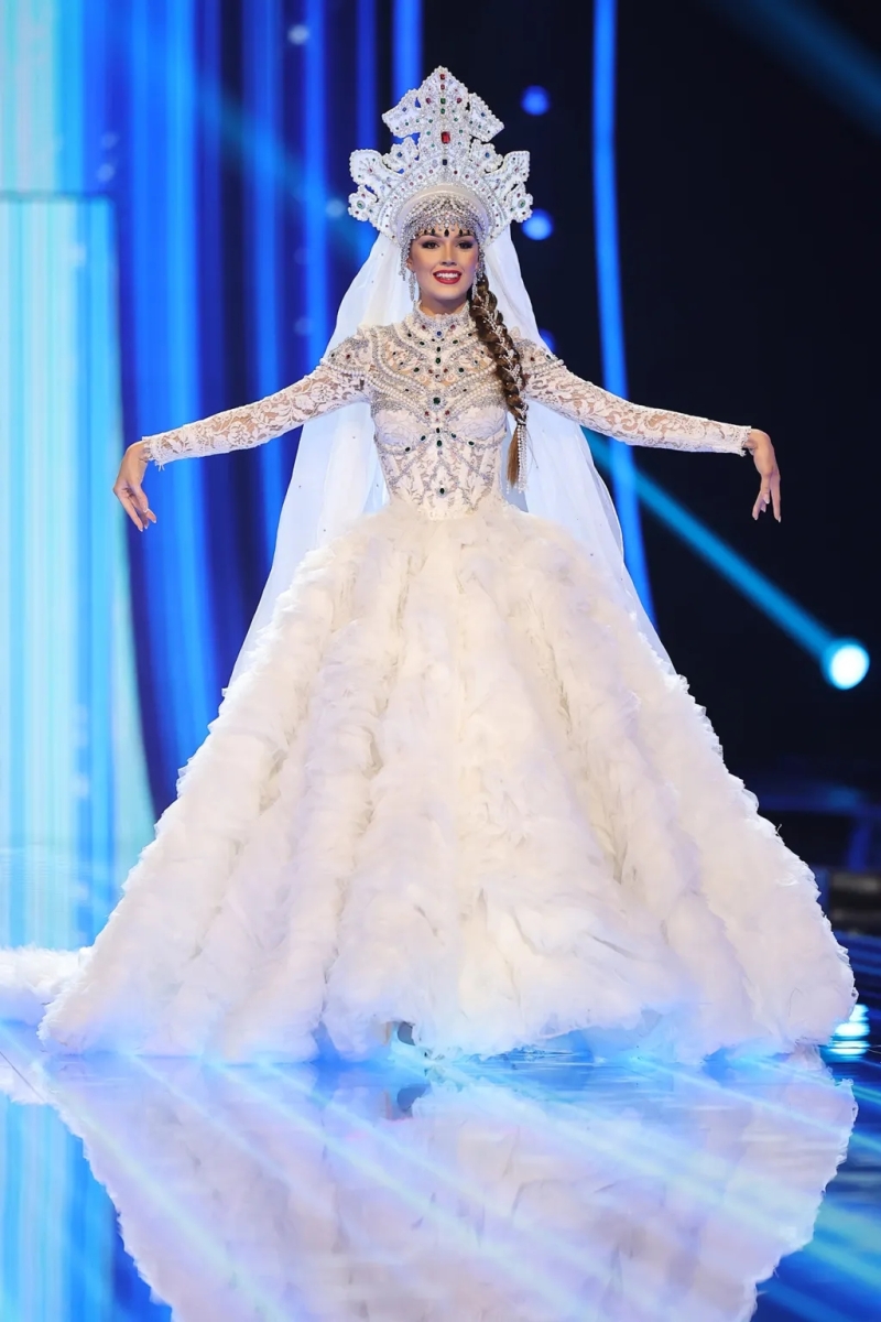 Конечно начнем с "Мисс Россия 2025" Анастасии Венза. Национальный костюм для конкурса создал известный российский дизайнер и заслуженный художник РФ Игорь Чапурин. Белое шелковое платье украшено золотым кружевом и кристаллами Swarovski, а уточненная накидка в старорусском стиле подчеркивает царственность и величие образа. Белый цвет символизирует чистоту и свет русских древних городов и церквей, а золото — сияние куполов храмов. Традиционная вышивка несет в себе русский культурный код, соединяя любовь к истории и культуре нашей страны. "Этот национальный костюм, уникальный, красивый, с таким серьезным символизмом, и очень женственный и нежный. Нам хотелось в этом году сделать акцент не на привычных для международных конкурсов бутафорских больших костюмах, где большие перья и что-то такое яркое и интересное. Нам хотелось сделать акцент на элегантности и на традиционной русской красоте" - сказала Анастасия Беляк, директор конкурса «Мисс Россия» на пресс-конференции перед отправкой Анастасии Вензы на конкурс «Мисс Вселенная»